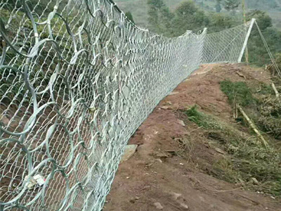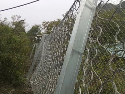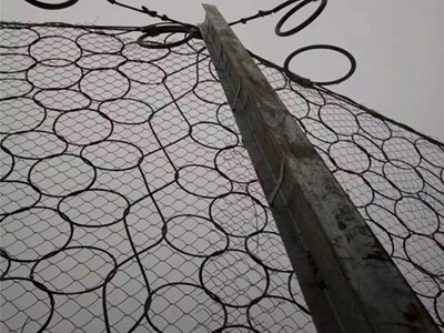环形网是有单根钢丝盘结而成两端头间搭接长度不小于100mm。盘结而成的环用钢质或铝合金紧固件至少在均匀分布的三处箍紧,且其中一处位于两端头的搭接处,除边缘环孔外,每个环与其周边的4个环相扣联。单机具即可进行系统的安装、维修和部件更换。